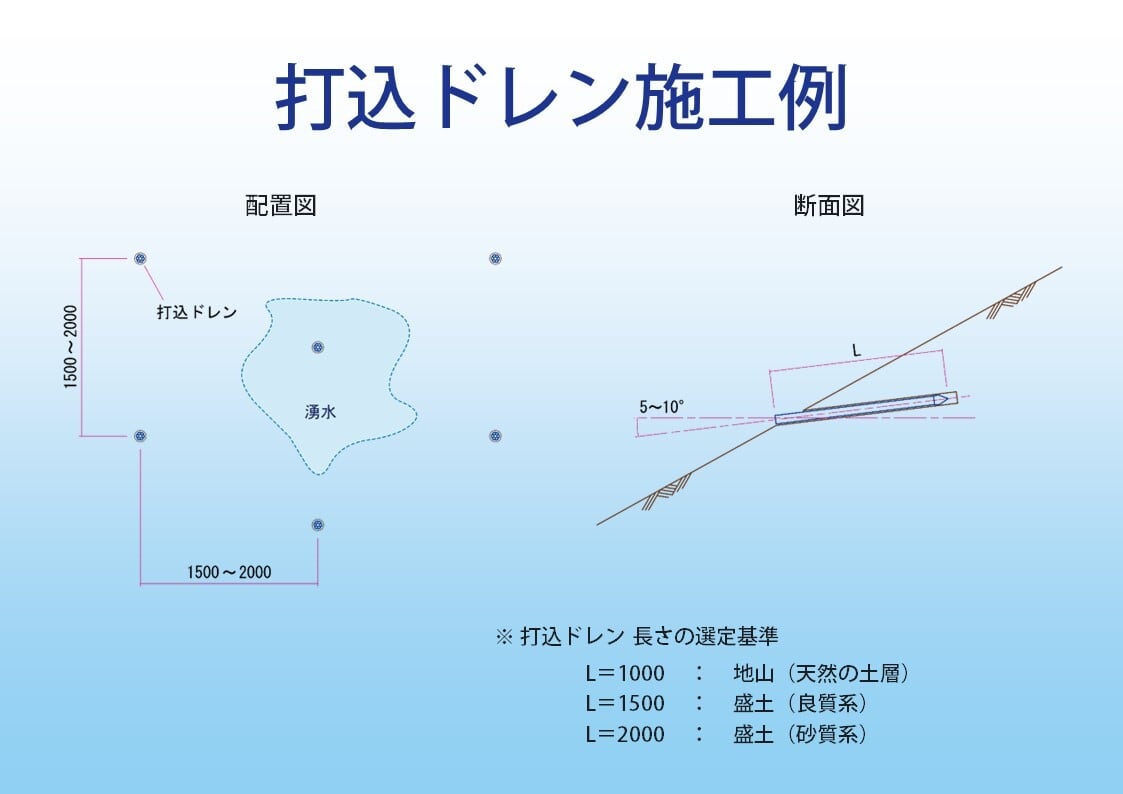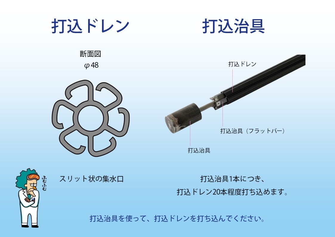 ★送料込み ★本製品は打込治具を含みません。 打込ドレン【2本セット】 直径:矢先部φ52 本体部φ48 長さ:1.5m 用途: 法面排水、地すべり予防 特徴: 法面や擁壁に直接打ち込む水抜き材。連続したスリット状の集水口なので、水垢等の付着物による目詰まりを起こしにくい構造です。 補足: 打込治具1本につき、打込ドレン20本程度打ち込めます。